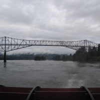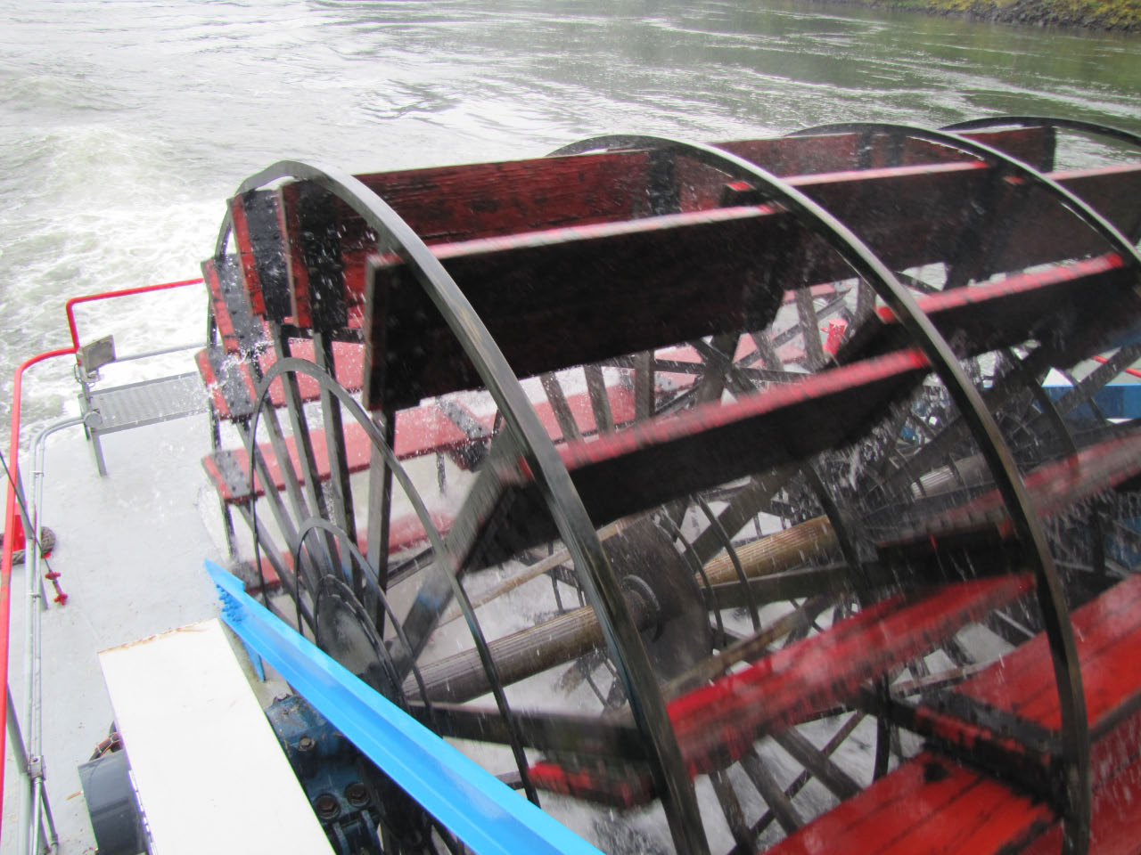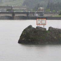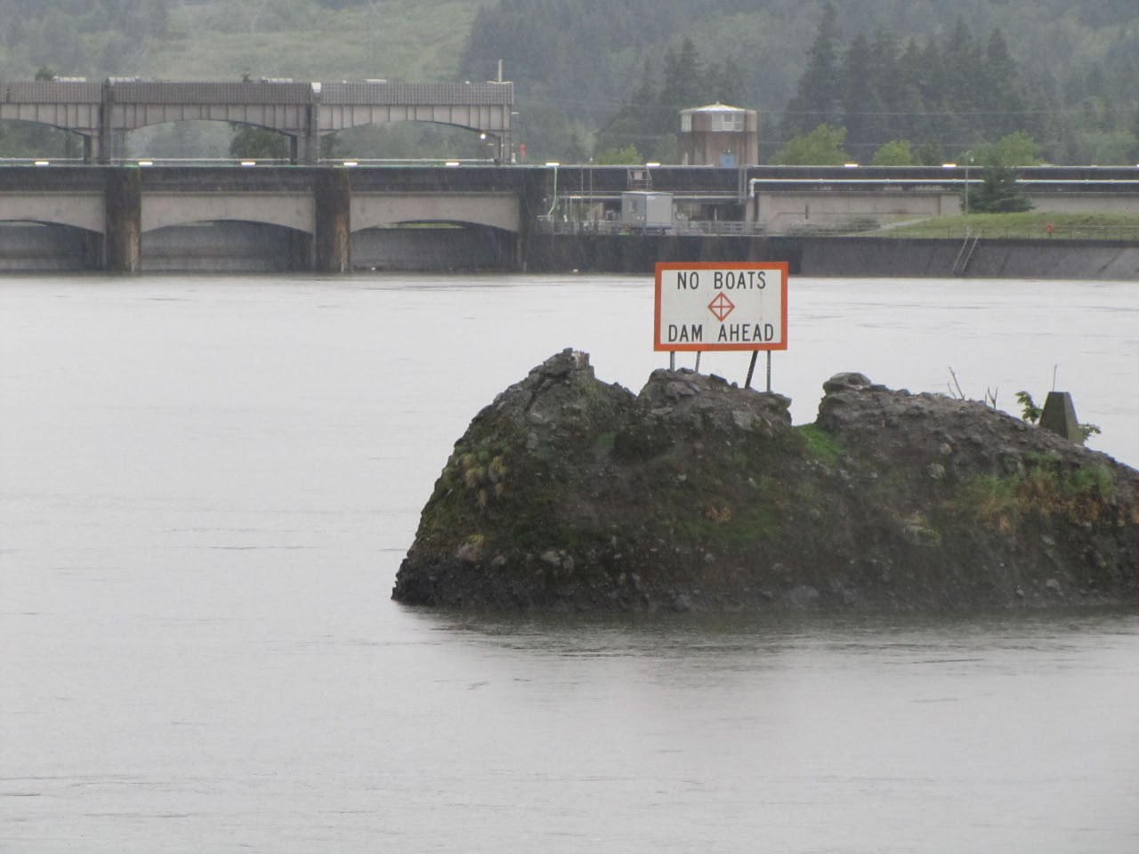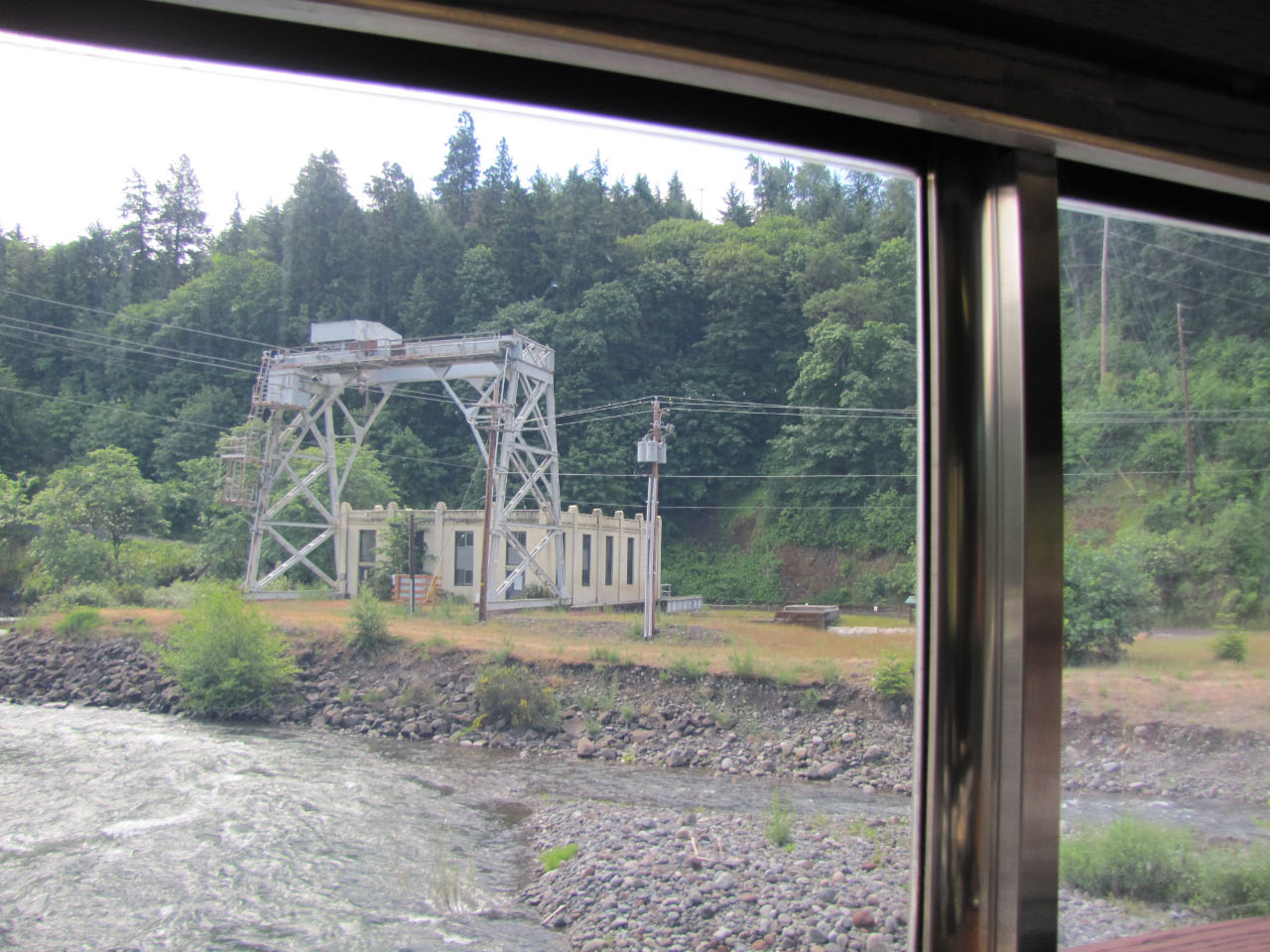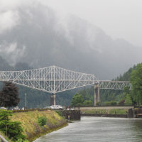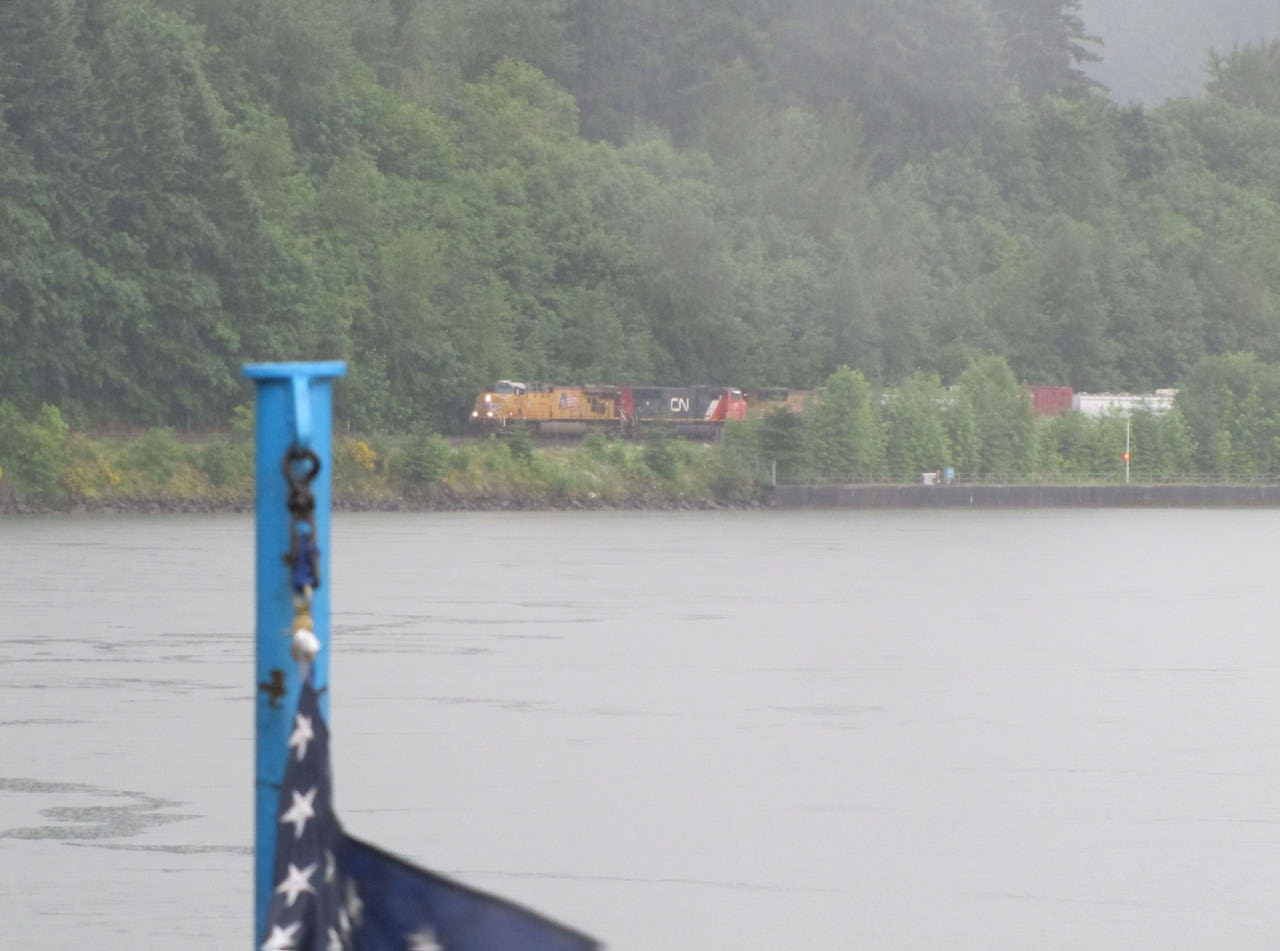 Then, after a rest back at the house, we drove out to the town of Cascade Locks, Oregon, to board the Columbia Gorge sternwheeler for a dinner cruise. The food was okay, but the views of the cloud-covered Columbia Gorge (and a different angle on the Bonneville Dam) were pretty impressive.