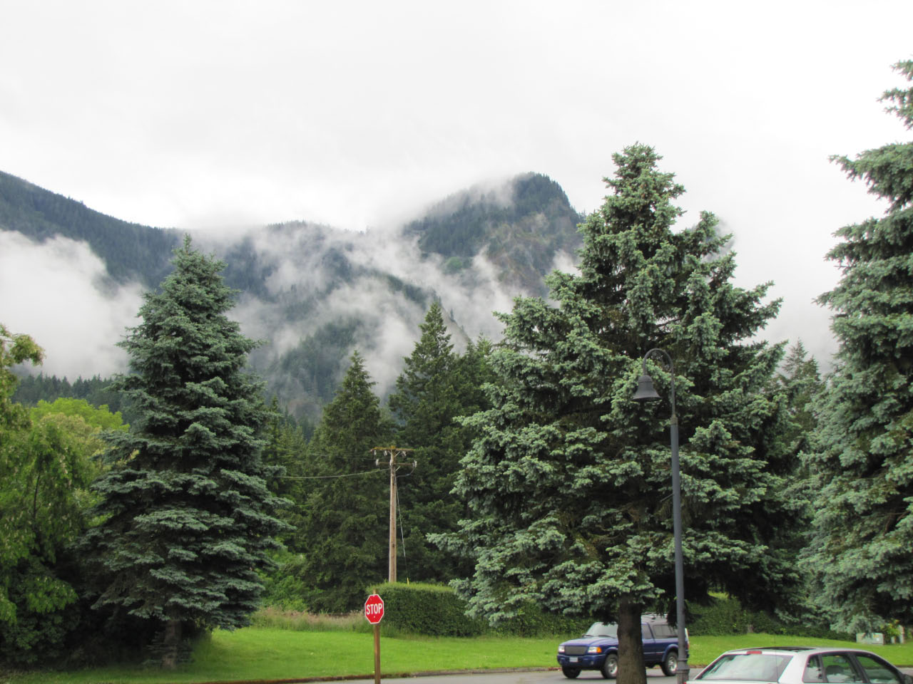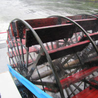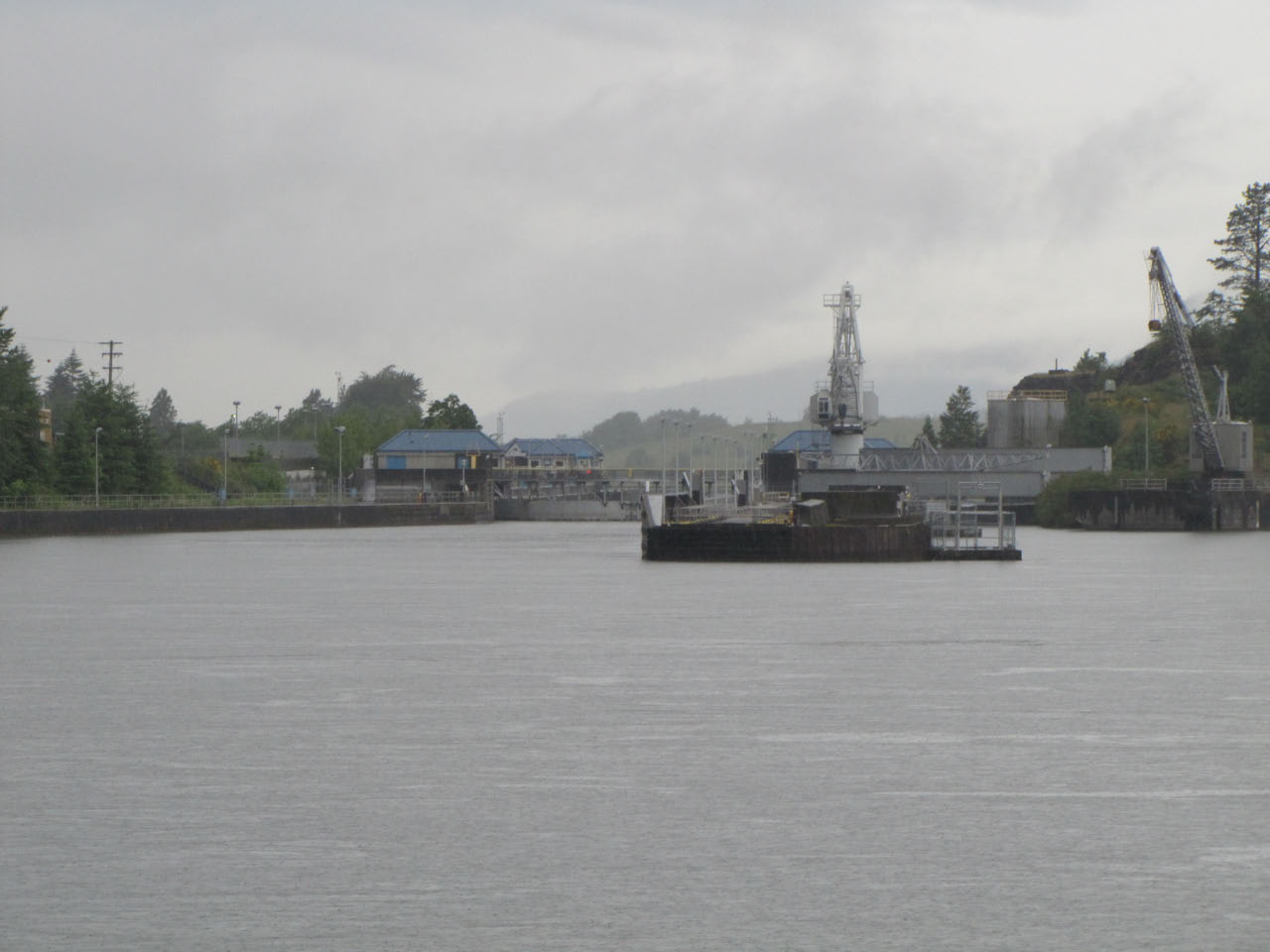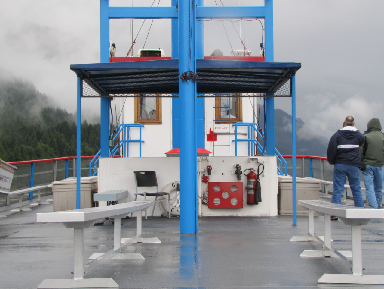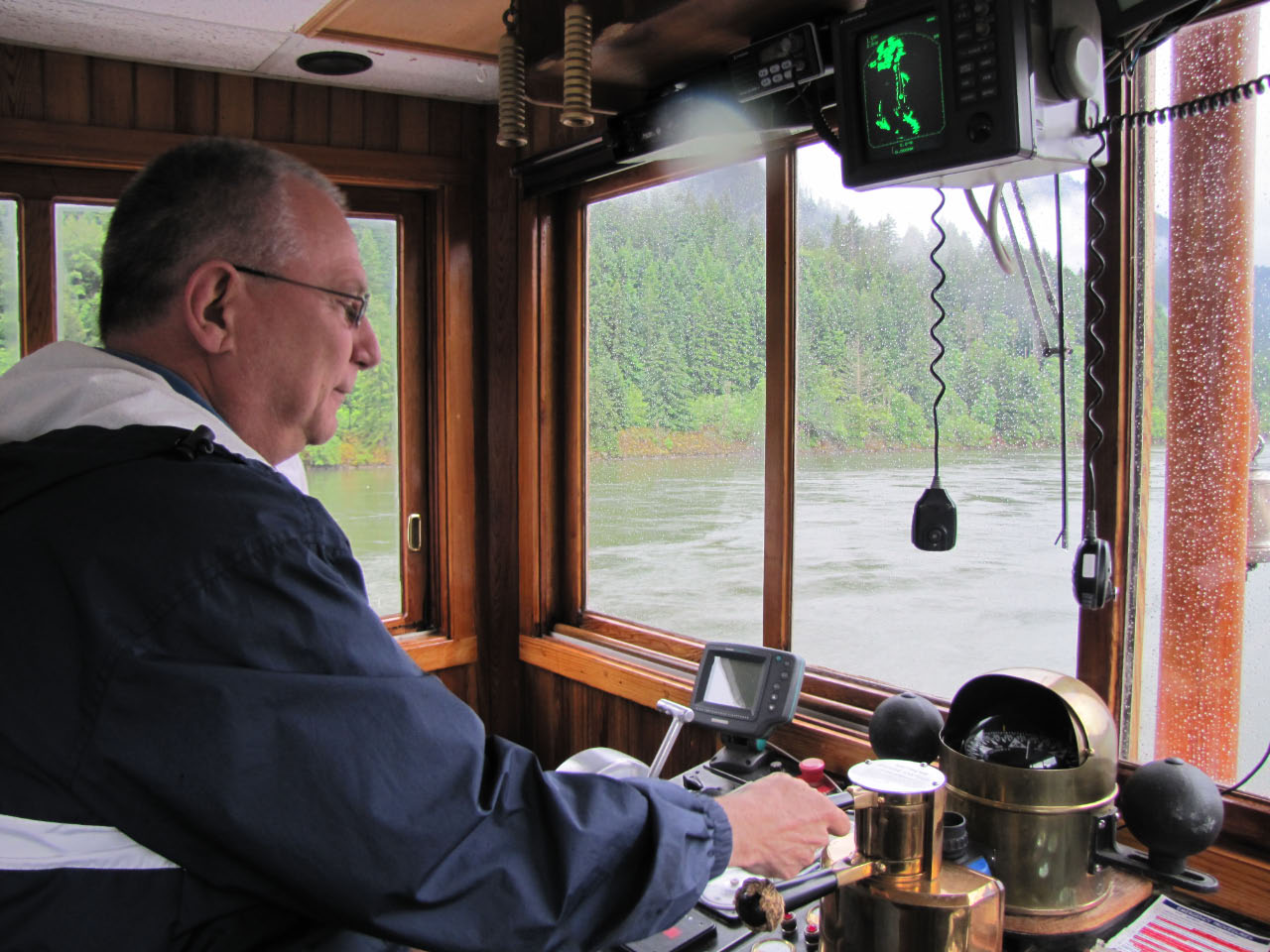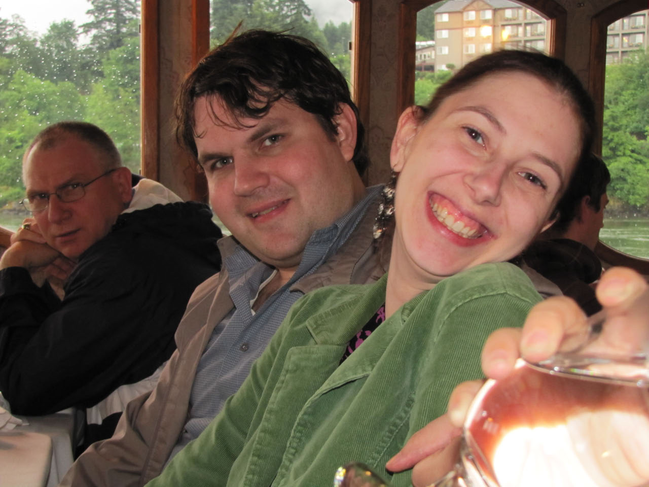 Then, after a rest back at the house, we drove out to the town of Cascade Locks, Oregon, to board the Columbia Gorge sternwheeler for a dinner cruise. The food was okay, but the views of the cloud-covered Columbia Gorge (and a different angle on the Bonneville Dam) were pretty impressive.