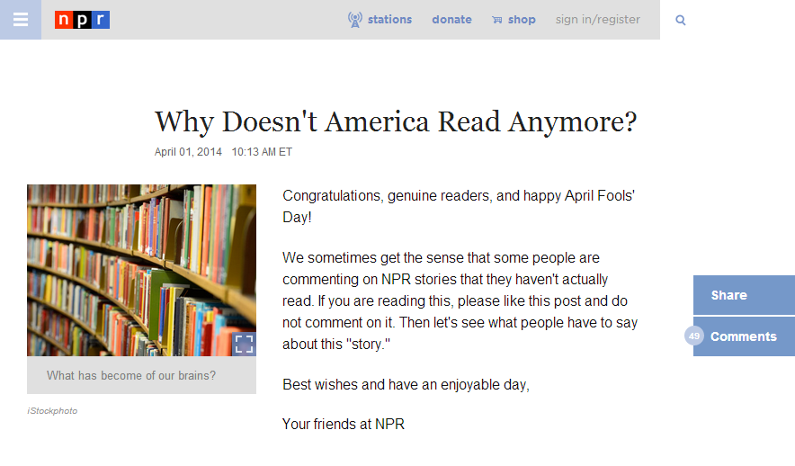 And I have to admit that NPR’s ‘April Fools’ prank is one of the most clever ones to go around on the Internet last Tuesday. They posted an article titled ‘Why Doesn’t America Read Anymore?‘ The article, however, had nothing to do with the headline: “Congratulations, genuine readers, and happy April Fools’ Day! We sometimes get the sense that some people are commenting on NPR stories that they haven’t actually read. If you are reading this, please like this post and do not comment on it. Then let’s see what people have to say about this ‘story.'” You can imagine how it turned out. . . . There are a few gems in the comment area beneath the article itself, but most of the action is on their Facebook post.