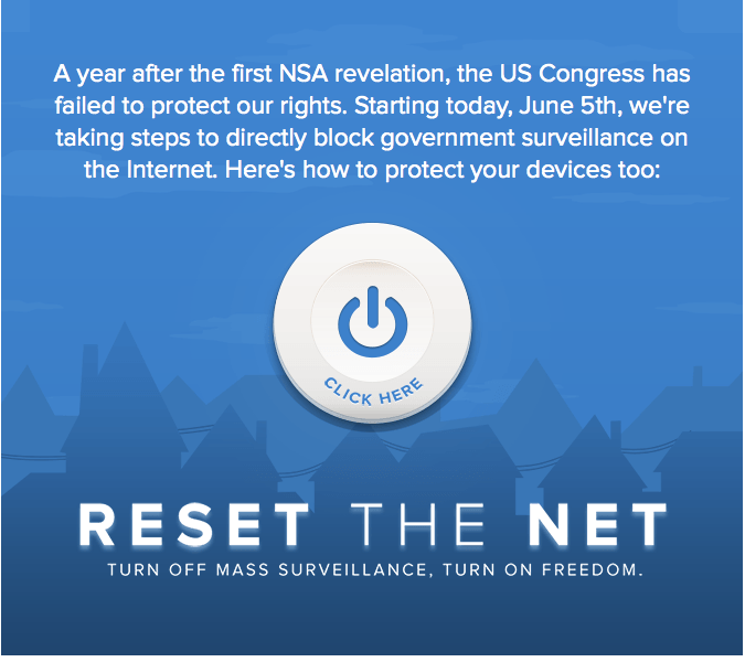 Off on a Tangent is proud to join with Fight for the Future, the Electronic Frontier Foundation, the American Civil Liberties Union, the Freedom of the Press Foundation, Google, Mozilla, and countless other organizations and web sites that are working to Reset the Net. We are improving privacy protections, directing visitors to useful privacy tools, and generally ‘making noise’ about civil liberties, Internet freedom, and the right to be secure in our “persons, houses, papers, and effects.”