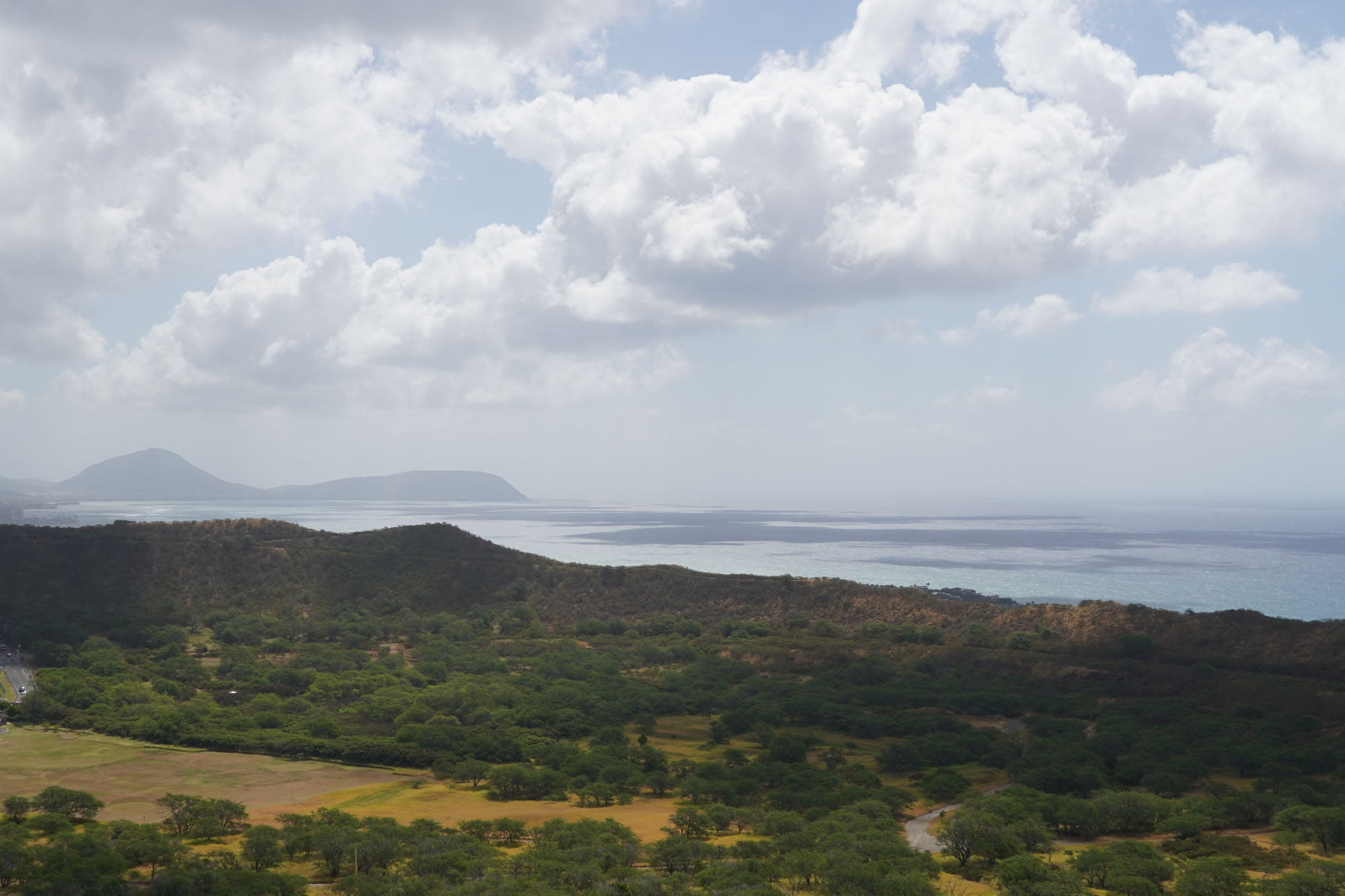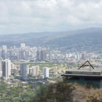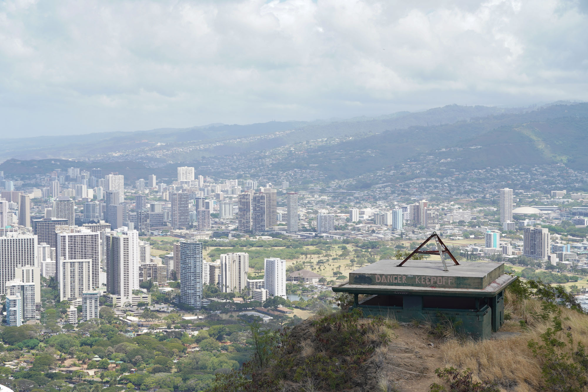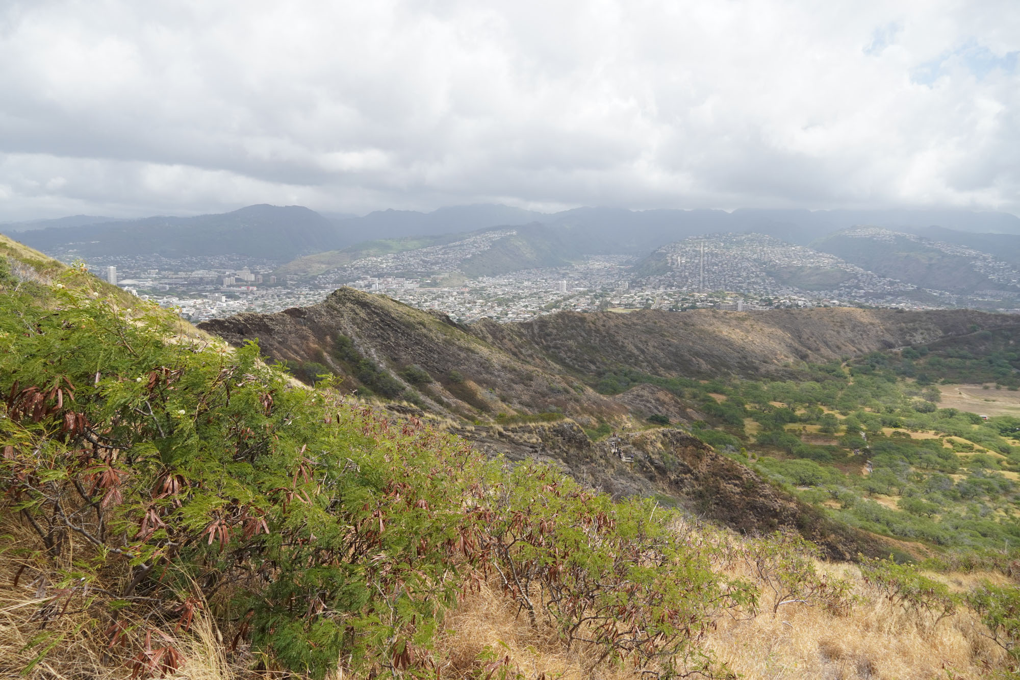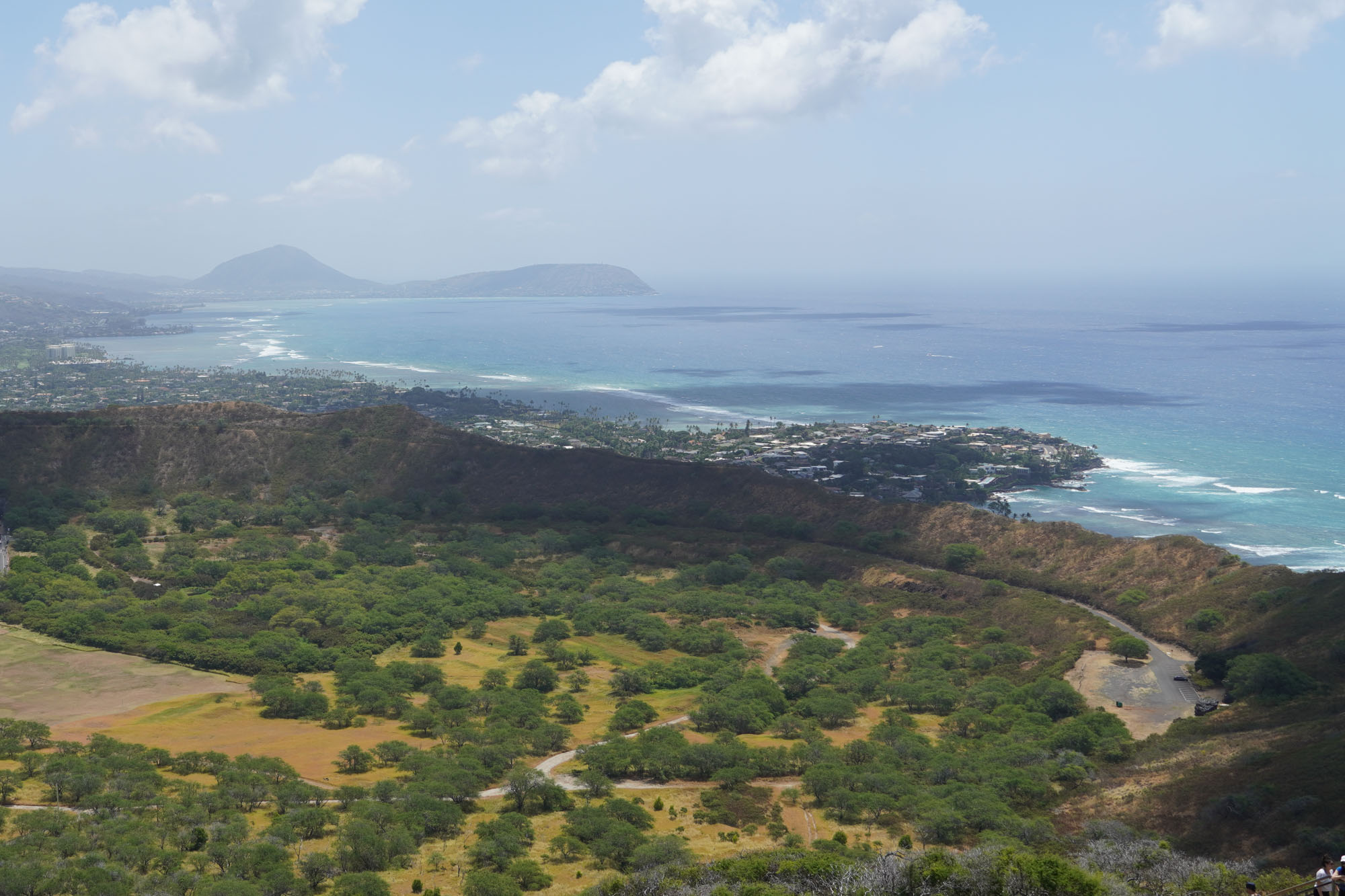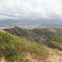 Diamond Head is a volcanic crater located near Waikiki. The Diamond Head State Monument is a park located inside the crater with a hiking trail that leads up to the rim.