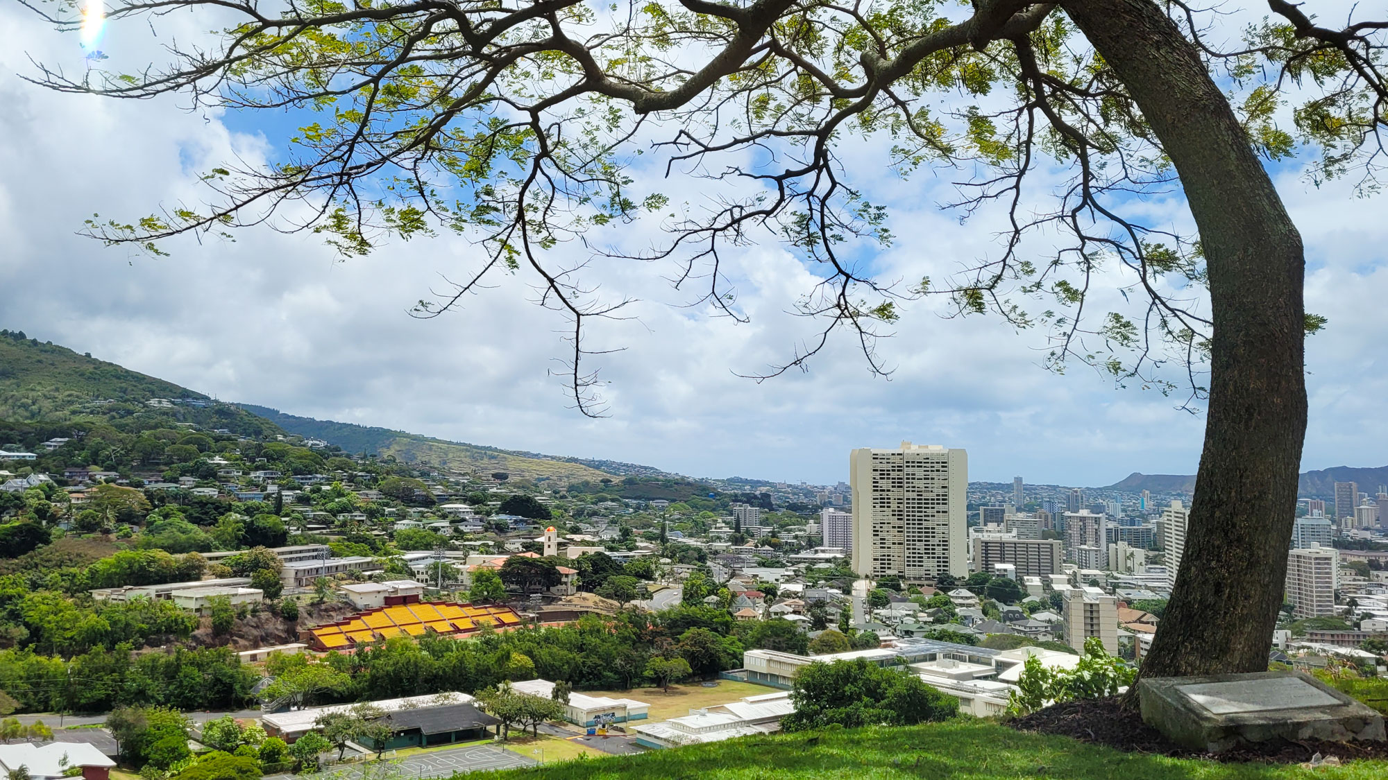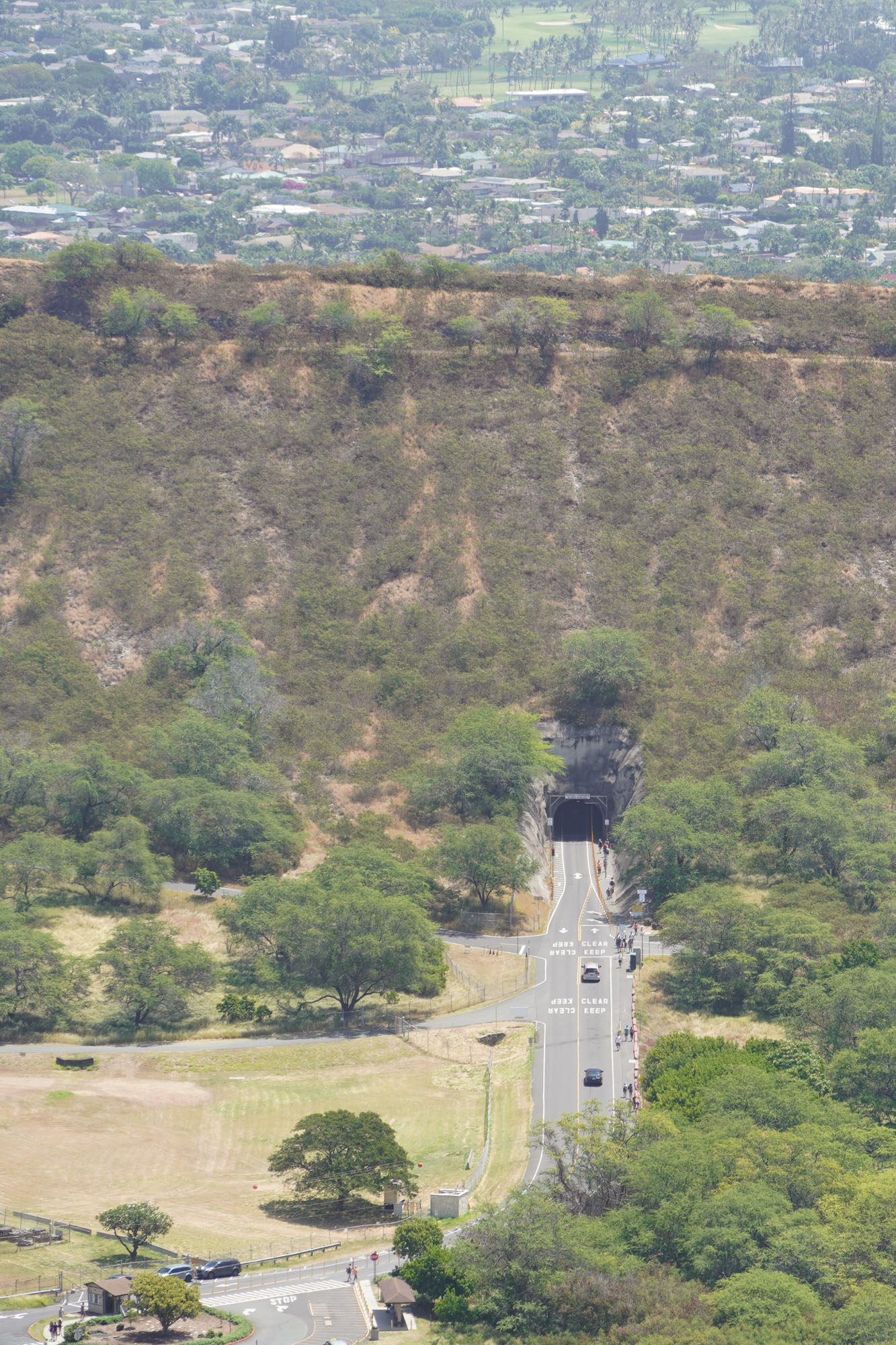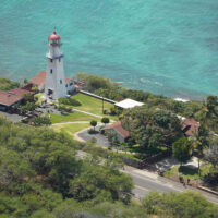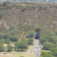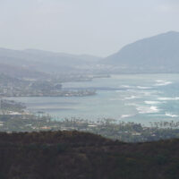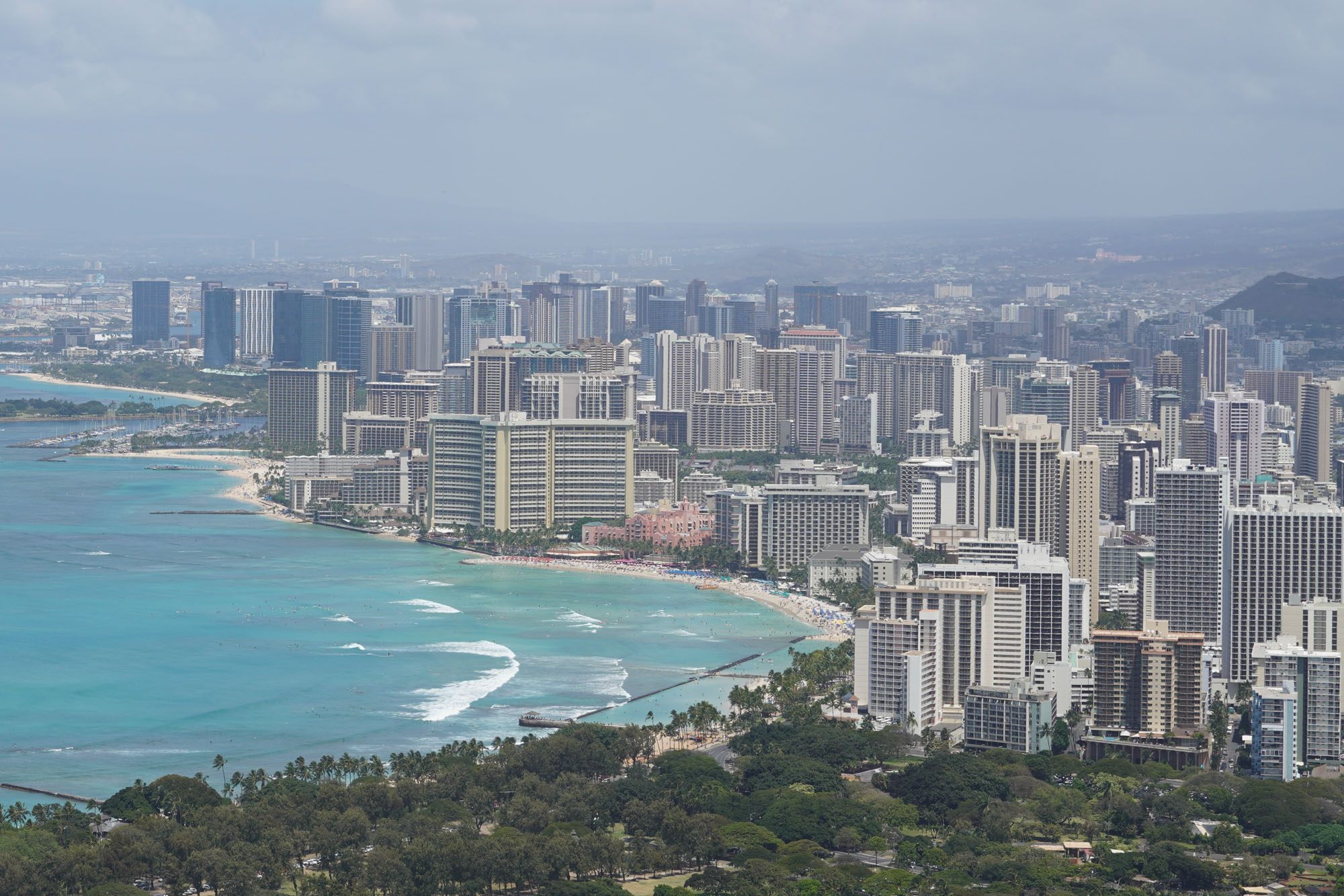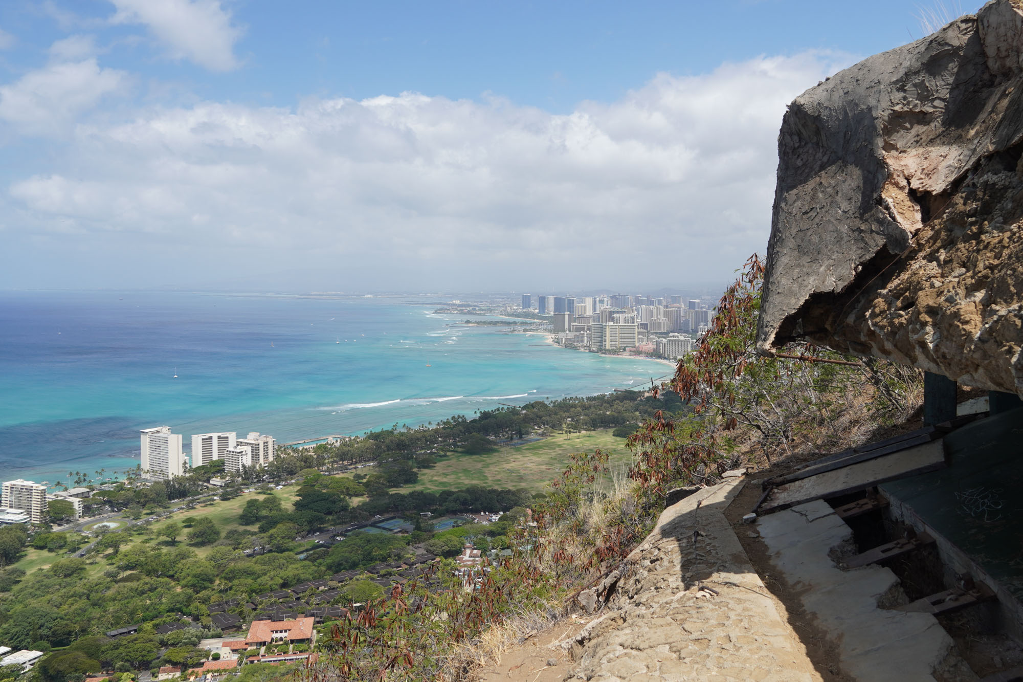 Diamond Head is a volcanic crater located near Waikiki. The Diamond Head State Monument is a park located inside the crater with a hiking trail that leads up to the rim.
