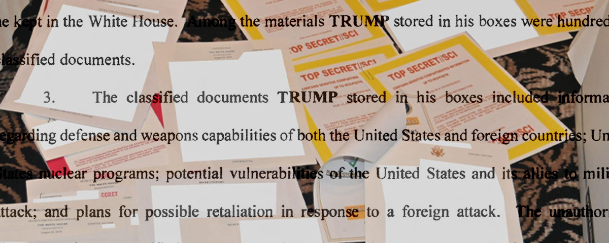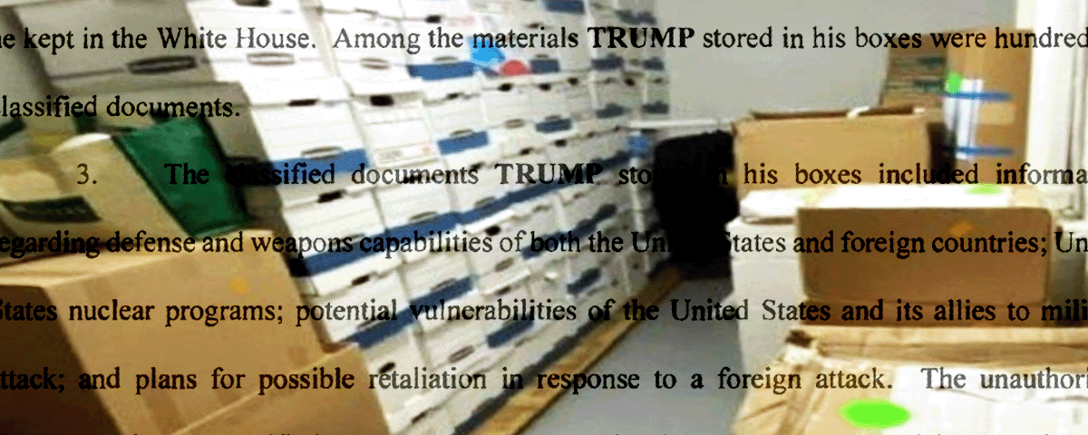 In the interest of fairness and accuracy, I have replaced the image with one showing document boxes in the storage room at Mar-a-Lago overlaid with text from the indictment. It incorporates a photo from the indictment itself, which was taken before the boxes had been opened and examined by the FBI.