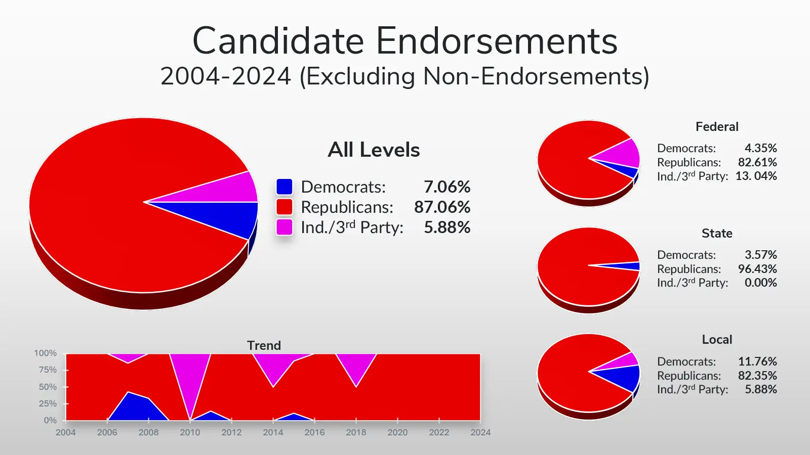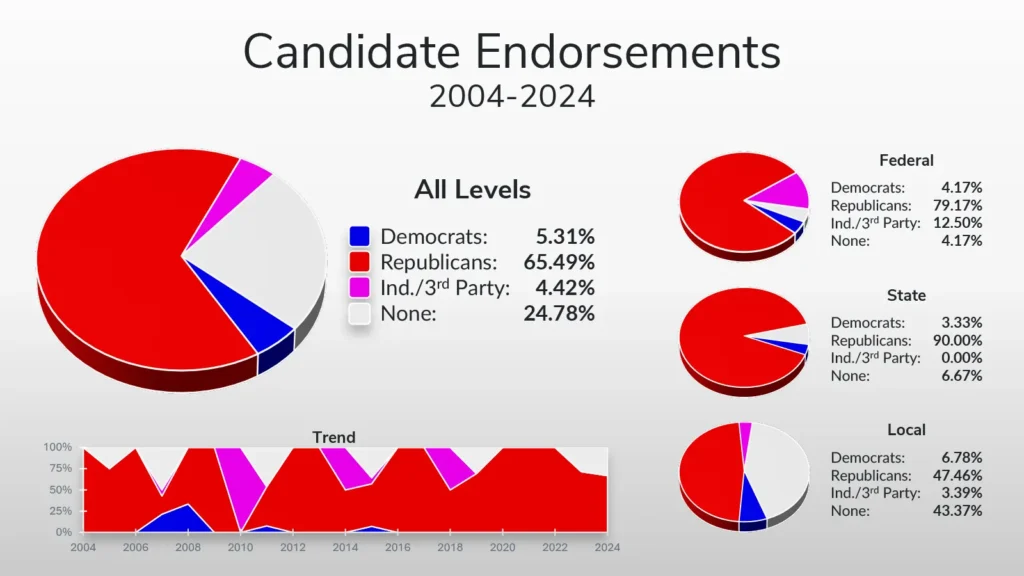The graphic below is a visual breakdown of endorsements in candidate races over the twenty-year period from 2004 to 2024. The large pie chart covers federal, state, and local levels combined. The smaller charts show each level of government individually. At the bottom is a stacked bar chart representing trends over time.