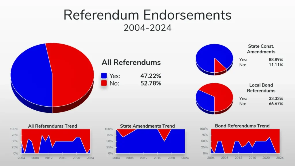 This graphic is a visual breakdown of my endorsements in referendums over the twenty-year period from 2004 to 2024. The large pie chart covers both Virginia constitutional amendments and local bond referendums. The smaller charts show the two types of referendums individually. At the bottom are stacked bar charts representing trends over time.