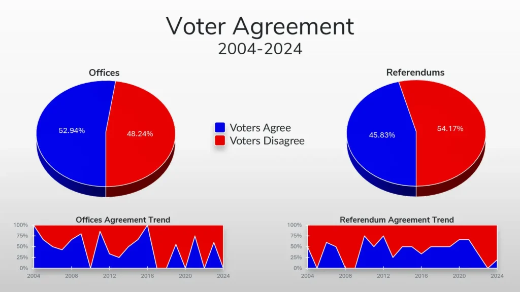 It’s also interesting to look at whether or not the voters agree with me—that is, do my endorsed candidates and referendums end up winning? The following image shows voter agreement for offices (candidate races) and referendums, and trends over time: